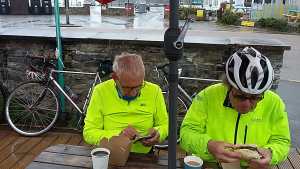 Demoralised by the ever decreasing team numbers we pressed on through Rosewarne and past Tehidy to Portreath, to the Hub, where Fred, Phil S and Simon sat smugly, if somewhat soggy, under an umbrella, not for the sunshine you understand! They had taken a similar route but not stopped for shelter.