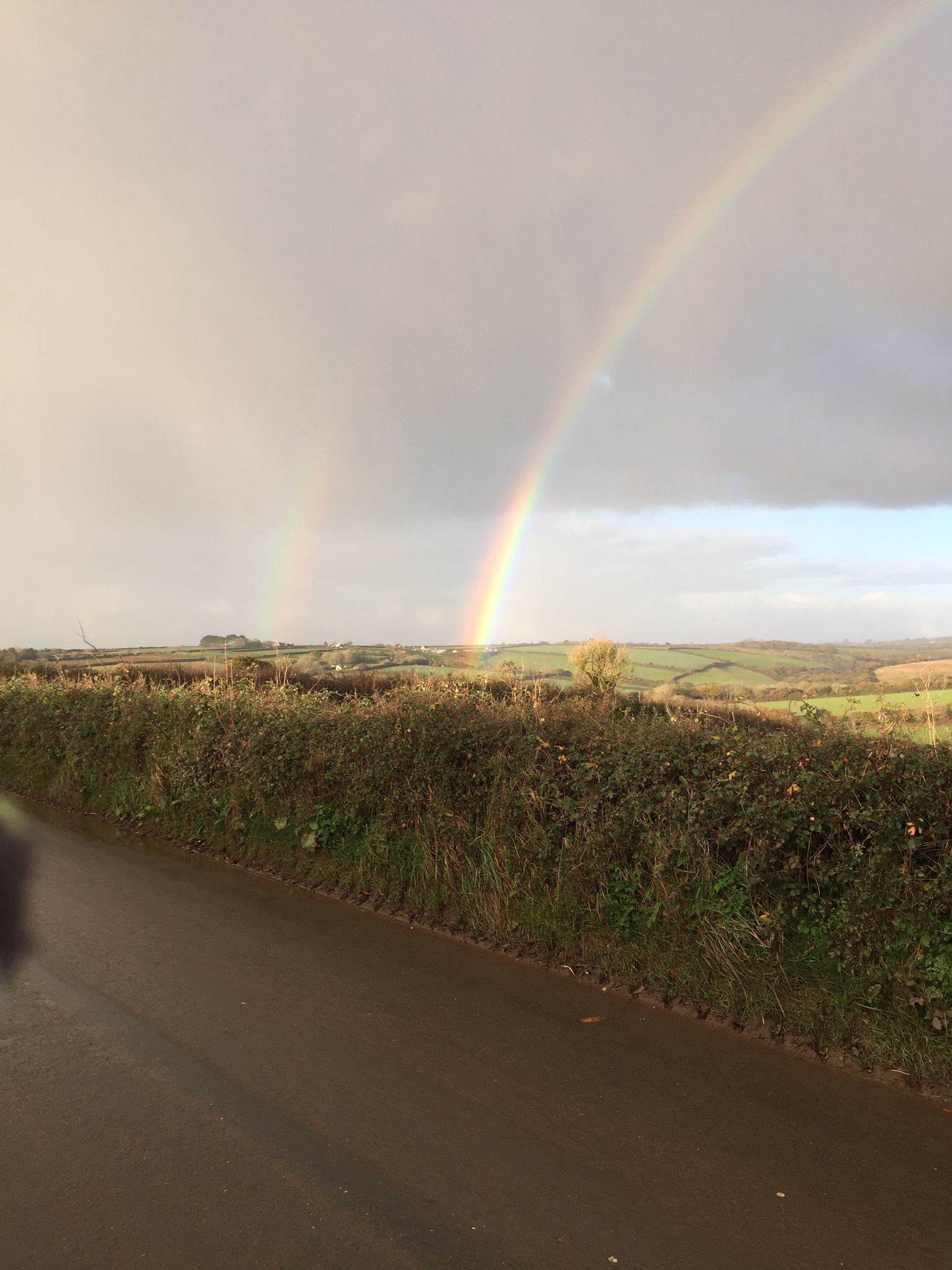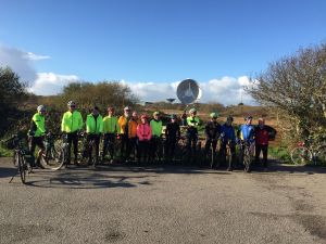 Rain clouds loomed ominously as I made my way to rendezvous at “Goonhlly” Nature reserve Car Park. A stunning rainbow glowed in the valley before Gweek. I had said I would meet Simon at Gweek but he wasn’t there. I waited a while, got cold so continued- sorry Simon. Ian caught me up along Gweek Drive and said Simon is looking for you ( Whoops) this he said as he whizzed passed me to do a few miles before we started. Anyway, twenty one riders turned up with twenty bikes (you can work that out). We were joined by three potential members who were sussing us out.